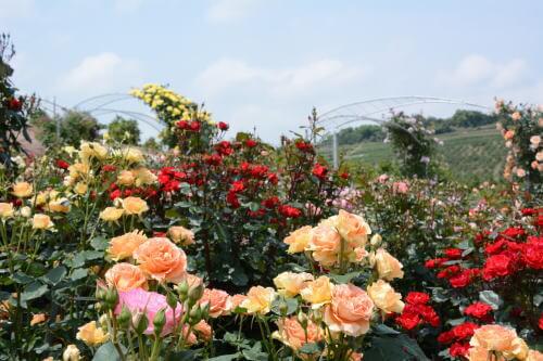 千財(せんざい)農園のバラ園にて色鮮やかに咲き誇る2,500本のバラが、天然の香水となって5,000平方メートルの広大な敷地を包み込みます。